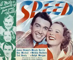 Speed is a 1936 Metro-Goldwyn-Mayer action film directed by Edwin L. Marin. It starred James Stewart, in his first starring role, and Wendy Barrie. Although only a low-budget "B" movie, the film was notable for its realistic cinematography by Lester White, incorporating scenes from the Indianapolis 500 race and on-location shooting at the Muroc dry lake bed, used for high-speed racing by "hot rodders" in the 1930s.[1] Advance publicity trumpeted that Stewart drove the specially-prepared "Falcon" to 140 mph (230 km/h).[2]