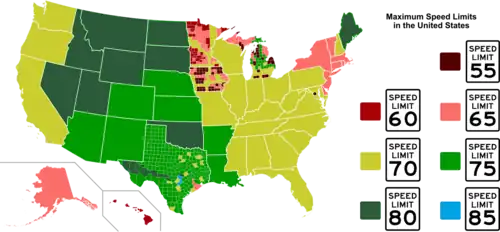 | 75–80 mph (121–129 km/h) | 65–70 mph (105–113 km/h)[56] | 45 mph (72 km/h) Not Posted[57] | 55–65 mph (89–105 km/h)[58] | 55–65 mph (89–105 km/h) | 20–35 mph (32–56 km/h) | ||