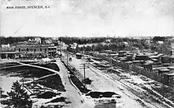 The town was named for Samuel Spencer, first president of the Southern Railway, who is credited with establishment of the railroad's mechanical shops at the site in 1896. The site was approximately the midpoint of the railroad's mainline between Atlanta, GA and Washington, D.C. As the shops were being built the Southern Railway developed a town, also named Spencer, alongside the shops for worker housing. Initially, the Southern partitioned 85 acres into 500 lots. Instead of creating a traditional "company" town in which the workers rented houses Southern sold the lots to workers or businesses for $100 apiece. The deeds did contain restrictive covenants which maintained that a dwelling costing in excess of $400 and approved by a Southern appointed architect be built within a year. The Southern donated lots for religious institutions. Southern also helped establish a YMCA in the town. The community grew quickly and by 1901 had 625 residents. By the 1920s it had 4,000 residents.[4]