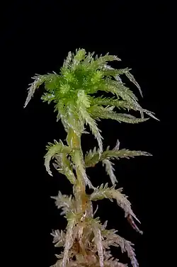 Sphagnum australe's anatomy involves a main stem segment and a branch fascicle which is a bunch of tightly arranged structures (usually two or three), with two spreading branches and three pendant branches,[4] hanging downwards. The top of the moss, the capitulum (a rounded protruding top of the plant), has a tuft like appearance with a cluster of tiny young branches of younger growth. There are leaves of various size and spacing down the stem. The stem leaves are smaller than the spreading branch leaves. Branch leaf cells are clustered and have cells containing chlorophyll which are important for photosynthesis.