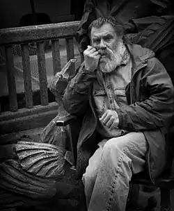 A homeless person is an individual without a consistent, fixed nighttime residence or someone whose nighttime residence is a supervised shelter that provides temporary housing.[11] Homelessness is a chronic stressor producing reduced wellbeing.[12] Homeless populations are a vulnerable population experiencing a higher prevalence of mental and physical health problems as well as victimization and increased mortality rates.[11] Spirituality is one method some homeless individuals use to cope with their position of high vulnerability. Runquist and Reed (2007) found that spiritual perspective correlated positively with measures of wellbeing among the sample of homeless individuals surveyed and that measures of wellbeing correlated positively with self-rated health status.[11] Social capital resulting from spirituality or religion, according to Irwin (2008), is a critical factor to wellbeing among homeless populations. It increases the resource base of the individual enabling them to cope with their situation in healthier ways.[12]