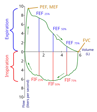 MMEF or MEF stands for maximal (mid-)expiratory flow and is the peak of expiratory flow as taken from the flow-volume curve and measured in liters per second. It should theoretically be identical to peak expiratory flow (PEF), which is, however, generally measured by a peak flow meter and given in liters per minute.[16]