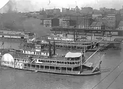 The Spread Eagle was a steam-driven sidewheel riverboat that transported passengers, goods and supplies to the forts and trading posts along the Missouri River between 1857–1864. It was constructed and launched at Brownsville, Pennsylvania. The vessel was a wooden hull packet, 210 feet (64 m) long, with a beam of 36 feet (11 m), a draft of 6 feet (1.8 m), and was rated at 389 tons.[1] It was powered by two steam engines with 3 boilers each, at 40 inches (1,000 mm) in diameter and 24 feet (7.3 m) in length. The Spread Eagle was constructed by Captain Benjamin Johnson who sold the vessel to the American Fur Company upon her arrival at Saint Louis, Missouri. Commanded by captain Bailey, she was once engaged in a race along the Missouri from St. Louis to Fort Benton where she rammed her opponent.[2][3]