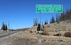 Spring Creek Pass, elevation 10,898 ft (3,322 m), is a mountain pass on the Continental Divide in the San Juan Mountains of Colorado. The pass is traversed by State Highway 149, and the Continental Divide Trail and Colorado Trail follow the divide and cross the highway here. Somewhat unusually for a pass on the Continental Divide, it is not the highest point on the highway in the vicinity; heading north from the pass, the road climbs over the considerably higher Slumgullion Summit before descending toward Lake City.