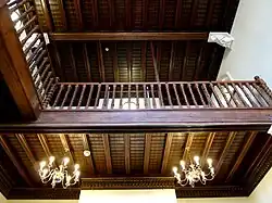 The dark-varnished and galleried staircase retains faded gilding and stencilled motifs on its first floor ceiling and on the underside of the first landing, visible from the ground floor. The decorative, carved frieze around these ceilings also still has old and faded gilding.[21] The newel post is of unusual design.[22] There are four carved wood and plaster corbels supporting the first floor staircase ceiling. They represent a woman with grapes and flowers, a winged cherub, a man with harvest motifs and a full-bearded man in medieval costume, carrying scrolls.[21][23][24][25] In the latter corbel which overlooks the stairwell, the bearded man's profile is similar to Barber's profile in his portrait by David Wilkie Wynfield, and his scrolls are long and slim enough to be building plans. These details beg the question as to whether it is a portrait of the architect, placed to overlook his work.[25] The plaster corbels on the ground floor staircase ceiling are carved with lions, in connection with the Holdsworth family crest.[17][26]