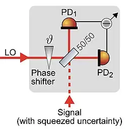 Squeezed states of light can be fully characterized by a photo-electric detector that is able to (subsequently) measure the electric field strengths at any phase . (The restriction to a certain band of modulation frequencies happens after the detection by electronic filtering.) The required detector is a balanced homodyne detector (BHD). It has two input ports for two light beams. One for the (squeezed) signal field, and another for the BHDs local oscillator (LO) having the same wavelength as the signal field. The LO is part of the BHD. Its purpose is to beat with the signal field and to optically amplify it. Further components of the BHD are a balanced beam splitter and two photo diodes (of high quantum efficiency). Signal beam and LO need to be overlapped at the beam splitter. The two interference results in the beam splitter output ports are detected and the difference signal recorded (Fig. 7). The LO needs to be much more intense than the signal field. In this case the differential signal from the photo diodes in the interval is proportional to the quadrature amplitude . Changing the differential propagation length before the beam splitter sets the quadrature angle to an arbitrary value. (A change by a quarter of the optical wavelength changes the phase by .)