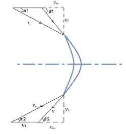 This relatively simple equation is used frequently while drawing the velocity diagram. The velocity diagram for the forward, backward face blades shown are drawn using this law. The angle α is the angle made by the absolute velocity with the axial direction and angle β is the angle made by blade with respect to axial direction.