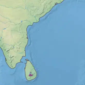 Sri Lanka detached from the Deccan peninsula during the end of the Miocene epoch, but its origin lies within Gondwanaland.[2] According to biogeographic patterns southwestern lowland wet forests became isolated from the nearest wet forests in the mainland soon after the separation when climatic changes created drier, warmer conditions in the lowland. Although the two lands bridged in the Pleistocene subsequently, intervening dry habitat prevented the exchange of wet climate adapted species with wet forests in India. This resulted in southwestern species to evolve and specialize separately, giving rise higher to the higher level of endemism that can be seen today.
