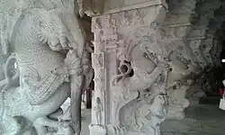 The Vijayanagar and Nayak kings commissioned paintings on the walls of the shrine of temple, some of which are still present.[5] Thiruvengadamudayan hall, located to the right of the gopuram, houses rare life size sculptures commissioned during the 16th century. It was built by Vadamalayappa Pillai, an official in the Madurai Nayak kingdom. There are numerous images of yalis, elephants and deities in the hall, some of which are even 5 ft (1.5 m) wide. The major images seen in the temple are that of Bhikshatana, Venugopala, Krishna as Madanagopala, Krishna as Govardhanagiri, Nammalvar, Kamadeva (Manmatha) and Rati. Depiction of Hanuman in various poses can be seen in the temple. There are life size images of Agora Virabhadra and warriors. Rama is seen hugging the monkey king Sugreeva with his right hand and holding his bow in the left and on his left stands Sita, while in another pillar he is seen hugging Hanuman with his right hand and Angada seen standing in anjali. A host of monkey warriors standing at the bottom of both the sculptures.[3] The composite columns of Virabhadra holding sword and horn are found be additions of the Vijayanayagara kings during the early 1500s.[6]
