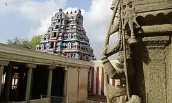 Lions, Yalis and elephants are carved in the pillars of the mandapam. The temple served as a fort during the patriotic war of Kattabomman with the British.[7] The temple has a nine-tier rajagopuram amidst lush vegetation around the temple.[3]