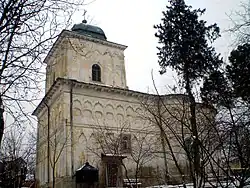 The church was built outside the old city walls, in a place known as the paupers' cemetery.[2] Atop the vestibule,[2] it has a single massive square spire, with five bells inside. Trefoil in shape, it has a foyer, vestibule, nave and altar; it is in the usual Moldavian style. The exterior walls are plastered and decorated with pilasters on two levels, one deep and the other in relief. Gheorghe Balș noted the prettiness of the iconostasis. The entrance is to the south.[1] Today, the interior walls are not painted, merely decorated with icons, but they appear to have been painted in 1855 by an artist from Sibiu.[1] The church's valuables include two large 18th-century bells; a chalice from 1856; a silvered icon of the Virgin Mary from 1845; and 18th-century church books in Old Church Slavonic, Greek, and Romanian Cyrillic. An 1847 icon of Sabbas the Sanctified was brought by the donor from Mar Saba in 1905. The icon of the church's painters is also of note, old and decorated in silver.[1] In 1854, the first church choir in Moldavia was established here, after the Russian model. It was active for nearly six years, until the death of its founder, aga Evdochim Ianov; the initial director was Gheorghe Burada.[1][2]