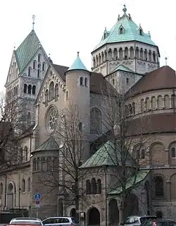 The church was built from 1887 to 1892 according to plans by Gabriel von Seidl in neo-Romanesque style.[2] Approximately parallel to this, the edge of the square was built on three sides by various architects in the neo-Renaissance style.