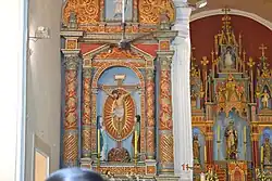 The high altar of the church extends almost to the roof, and carries statues of Sacred Heart, Our Lady and St Andrew. Smaller statues of St John the Baptist, St Sebastian and the Bom Jesu are above the main statues.[7] The 16th-century wood side altars were carved and painted in popular Portuguese style. The church also has 16th-century hanging wood panels depicting the Resurrection of the Christ and the Assumption of Mother Mary, and a 16th-century pulpit. One of the largest and oldest stone crosses in Mumbai is in its compound. This stone cross is carved from a single stone. Originally installed at the older Church of St. Anne, it was moved. The Maratha Army destroyed the church during the invasion of the settlement. The Church of St. Anne was formerly at the site of the current Bandra Bus Depot.