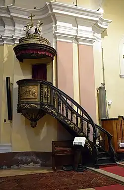 Between 1728 and 1736 the church was enlarged by Christian Obergruber, a master builder originally from Carinthia. A Baroque nave was added to the older part that was retained as the chancel. The main pieces of furnishings, including the pulpit and the altarpiece, were constructed in the 1740s. A crypt was built under the whole nave in 1749.[8] The slow pace of the construction shows that the financial resources of the parish were limited, although several citizens had left donations for the church.