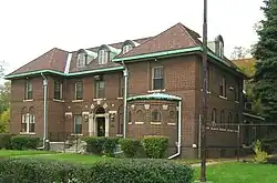 The church is the most visually catching structure. It is built in the form of a Latin cross, of mixed red and brown tapestry brick. The main façade has a gable form with a Romanesque arcaded portico containing the entrance and three tall windows above.[2] A wheel window is placed in the pediment. Single-story wings with entrance doors flank the front, and a tower is located on the right side of the building.[2]