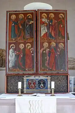 The winged altar, which has served as the main altar since the end of the 19th century, is composed of a central shrine with carved figures against a golden background and two hinged wings painted on both sides. Both the paintings on the wing panels and the lines of text on the front and back indicate that it was originally a Marian altar.[60] During a restoration in 1885-1887, it was redesigned as a crucifixion altarpiece.[61] The inscription on the altar wings indicates that the altar was consecrated in 1498. The altar was consecrated by Johannes, the titular bishop of Sidon and vicar general of Archbishop Berthold of Mainz.[62] There is no written record of the donor or donors of the altar.[63] The newly consecrated panel with carved and painted images of the Virgin Mary is mentioned in a certificate of indulgence from 1499.[60]