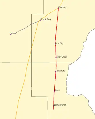 The two segments of track initially acquired by the St. Croix Valley Railroad included the 36 miles (58 kilometers) Amber Subdivision between Hinckley, Minnesota and North Branch, Minnesota and an 11-mile (18-kilometer) spur of the Hinckley Subdivision between Brook Park, Minnesota and Mora, Minnesota.
