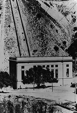 It was during the process of building the aqueduct that Mulholland first considered sections of San Francisquito Canyon as a potential dam site. He felt that there should be a reservoir of sufficient size to provide water for Los Angeles for an extended period in the event of a drought or if the aqueduct were damaged by an earthquake.[13] In particular, he favored the area between where the hydroelectric power plants Powerhouses No. 1 and No. 2 were to be built, with what he perceived as favorable topography, a natural narrowing of the canyon downstream of a wide, upstream platform which would allow the creation of a large reservoir area with a minimum possible dam.[14] A large camp had been set up to house the workers near this area, and Mulholland used his spare time becoming familiar with the area's geological features.