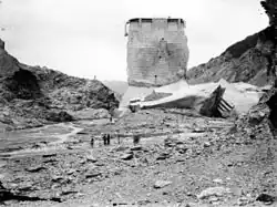 The St. Francis Dam, or the San Francisquito Dam, was a concrete gravity-arch dam located in San Francisquito Canyon in northern Los Angeles County, California, United States, that was built between 1924 and 1926.[2] The dam failed catastrophically in 1928, killing at least 431 people in the subsequent flood,[3][4] in what is considered to have been one of the worst American civil engineering disasters of the 20th century and the third-greatest loss of life in California history.[5][6][7]