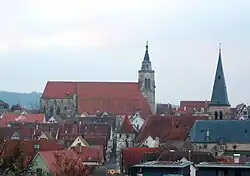 The Stiftskirche is a church located in Tübingen, Baden-Württemberg, Germany. It is a late Gothic structure built by Peter von Koblenz in 1470. The stained glass windows were designed by Peter Hemmel of Andlau who also designed windows in Ulm, Augsburg, Nuremberg, Munich and Strasbourg. It is the central landmark of Tübingen and, along with the rest of the city, the Stiftskirche was one of the first to convert to Martin Luther's Protestant church. It maintains (and carefully defends) several "Roman Catholic" features, such as patron saints.