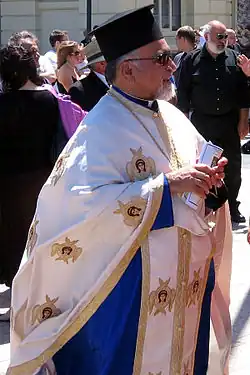 Father Diogenis Patsouris, Protopresbyter of the Ecumenical Throne OAM was then appointed parish priest of Saint George in 1970. Father Konstantinos Skoumbourdis was appointed assistant priest on 1 August 2012.[2] The Head Chanter at the church was Ilias Frangoulis, Archon Protopsaltis of the Greek Orthodox Archdiocese of Australia[3] until his retirement on 26 October 2011; he was succeeded by John Saredakis who was then succeeded by Con Psaromatis in January 2023. The Left Chanter is John Archontoulis who has been a Chanter at St George since its establishment in 1960. The chanters and assistant chanters form the choir, which chants every Sunday at St George Church.