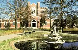 The monastic community grew steadily until 1901, when a fire destroyed much of the abbey. At the invitation of the city, the monks built their new monastery in Shawnee. At that time, they also established St. Gregory's College and High School, which was known as St. Gregory's University until it closed in 2017. The main building, known as Benedictine Hall, still stands (along with other former campus buildings), and is now owned by the Abbey after briefly being part of Oklahoma Baptist University's Green Campus.[2] They Abbey and former college grounds are listed in the National Register of Historic Places listings in Pottawatomie County, Oklahoma.[3][4]