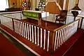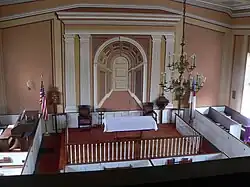 The interior furnishings are mostly of simple design. Slip pews with doors, each labeled with roman numerals, span the nave in four sections and extend along each side to frame the chancel. A balustrade with turned balusters spans the three sides of the chancel, opening with two gates at the back wall on each side. The gallery extending across the rear of the nave is accessed by a central staircase. Two flights rise along the back wall from each door to a shared landing, where a flying stair continues up to the gallery floor.
