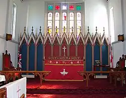 The principal feature of the sanctuary is a colourful painted wooden reredos dating from the 1870s. The church has an unusually wide centre aisle so that the troops attending services could march out four abreast.[2] Each row of pews was built by various members of the military and has its own individual design. The pews at the front of the church have more ornately carved ends as they were intended for officers.[2]