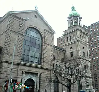 The Italianate / Baroque Revival church was built 1898–1900 to the designs of Delhi & Howard.[2] It is located on the southeast corner of Alexander Avenue and East 138 Street.[3] The New York Times reported on June 13, 1898, that "ground will be broken in a few days for a new church.... the new edifice is to cost about $100,000, and when completed will be one of the finest churches in the Borough of the Bronx. For several years past the present church, which is very old has been inadequate to meet the demands of the growing congregation. Plans for the new structure have been prepared by Dehli and Howard, Architects of 1193 Broadway. The church will be of brick and Dorchester stone, and will have a frontage of 80 feet on Alexander Avenue and a depth of 156 feet. One tall bell tower and two smaller towers will surmount the front of the building....The church proper will have a seating capacity of about 1,000 in the body and a gallery which will run back to the transepts, will accommodate about 400...."[1]
