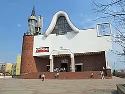 Following the massive development of blocks and panel construction in Dziesięciny I and Dziesięciny II districts, there was a growing demand for the construction of a church in the area. The place where the church stands today was used for gatherings of Solidarity members who also prayed and agitated for the church construction. The permission to build a new church was signed by Voivode of Białystok Voivodeship, Kazimierz Dunaj in March 1981 and the construction permit was given in February 1983.[3] This was the first formal permission given after the establishment of Communism to build a new Catholic church in Białystok.[4] As a result of the competition, the design of a two-level church with a catechetical complex by architect engineer Jan Krutul was selected. Construction works started in April 1983. The lower church was put into use in its shell state on June 21, 1984, and services began to be held there. The first service, midnight mass in the upper church was held on 25 December 1993. The colors of the church's facade refer to the country's national colours.