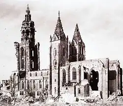 The reconstruction was divided into several phases. After the rubble was cleared away in 1946 and 1947, the reconstruction began in 1948 under the supervision of the renowned architect Professor Hannes Meyer.[7] Most Neogothical elements from the renovations made during the 19th century were not reconstructed, instead the architect aimed to bring out the Renaissance core of the church.