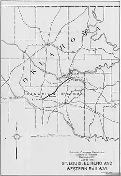 The St. Louis, El Reno and Western Railway was a small struggling railroad, started by local business interests in the Territorial Capital of Guthrie, Oklahoma. The railroad was built to move freight and passengers from eastern connections at Guthrie, West to the huge Rock Island Railroad hub and system cross roads at El Reno, Oklahoma. Working through the oil boom of the early-20th century with service to the South end of the large "Cashion Pool" and the boom towns of Piedmont, Richland and Navina.