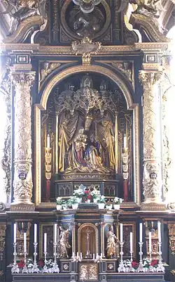 The interior is decorated in baroque style during the 17th century. The high altar with an Enthroned Madonna by Erasmus Grasser and paintings by Jan Polack (ca 1480) is a major sight.[1][2]