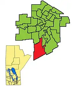 It was recreated by redistribution in 1979, and was contested at the 1981 Manitoba general election. It was abolished at the redistribution of 2018 and ceased to exist under its old name effective at the 2019 Manitoba general election. The riding was located in the southernmost tip of the City of Winnipeg.