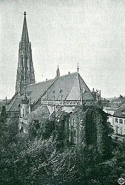 The original appearance of the church is not known. Between 1485 and 1496 it was rebuilt in the late Gothic style and greatly expanded. The foundation stone of the new structure was laid on 16 March 1485 by Alexander Bellendörfer (died 1512), the chancellor and prothonotary of Electoral Palatinate, whose epitaph is also preserved in the church. While evidence for late Romanesque and High Gothic predecessors is lacking, the late Gothic structure remains an important component of the modern church (walls of the choir and nave). In 1496, two chapels were added to the nave on the north and south sides. The sacristy was built later on the south side.