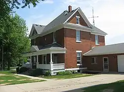 During the early years of the twentieth century, the Archdiocese of Cincinnati required each parish to construct a rectory for its parish priest.[6]: 4 St. Sebastian's Church arranged for the building of a rectory in 1905; it cost approximately $4,000.[2] Like the church, this rectory was designed by the DeCurtins family. A two-story brick house, it is typical of period rectories in its region; like St. Sebastian's, these structures are typically rectangles with hip roofs and equipped with verandas.[6]: 4 Two of its most elaborate features are a heavily ornamented entrance, decorated with stained glass and multiple transoms, and a central rose window that illuminates the second floor. Its foundation is built of ashlar, and its walls are laid in a stretcher bond, like those of the church. Although the rectory remains in a condition similar to the time of its construction, it has been expanded; a single room and a garage have been attached to its southern end, between the old part of the house and the rear of the church.[9]