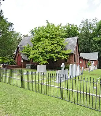 St. Stephen's Episcopal Church is an historic Episcopal church building located northeast of Ridgeway, South Carolina, on County Road 106.[2] Built of wood in 1854 in the Carpenter Gothic style, it was designed by the Rev. John Dewitt McCollough, who later became its rector. The exterior was painted a maroon color. In 1920, its exterior wood was covered by brick veneer, so that it appears today as a brick Gothic Revival style building on the outside while the interior retains its Carpenter Gothic features. A wing was added in the 1940s to create space for a parish hall and Sunday school.[3]