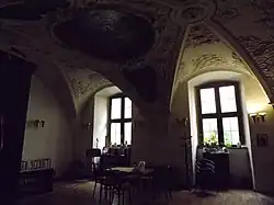 The choir with wooden balustrade stands on Tuscan stone pillars with capitals. There is a painted wooden ceiling under the choir. The western wall under the choir is painted with 4 Latin inscriptions, which were added in the reconstruction from 19th century. There is a columbarium under the choir.