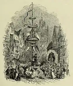 The church's curious name derives from the shaft of the maypole[5] that was traditionally set up each year opposite the church.[6] The custom continued each spring until 1517, when student riots put an end to it, but the maypole itself survived until 1547 when it was seized by a mob and destroyed as a "pagan idol".[7] According to John Stow, the chronicler who is buried here, they had it "raised from the hooks whereon it had rested for two-and-thirty years, sawn in pieces and burnt."[8]