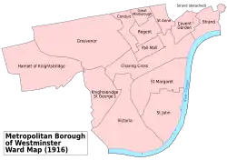 After the introduction of the New Poor Law, the parish was part of the Strand poor law union from 1836 to 1868.[4] It formed part of the Westminster union from 1868 to 1913[5] and the City of Westminster union from 1913.[6] When the parish of St Anne was abolished in 1922 it was merged with other parishes to form the City of Westminster parish for poor law purposes.