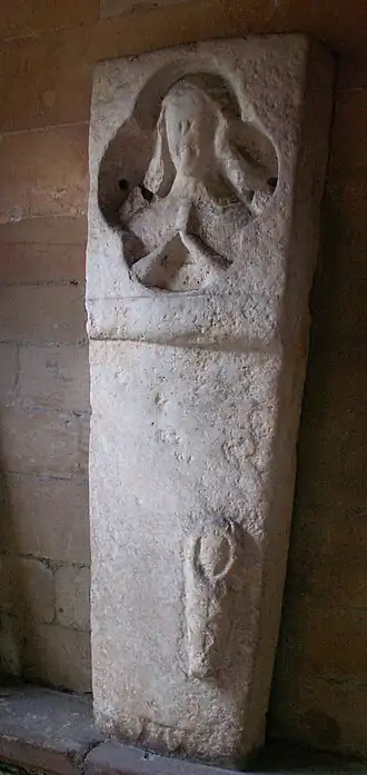 Within the porch is a 14th-century stone tomb cover with relief depictions of a woman's head and shoulders within a quatrefoil recess, and a shrouded baby. It was originally sited in the graveyard.[3][9] The porch contains an inscribed commemoration to the charity founded in 1824 by the Rev'd William Dodwell.[7]