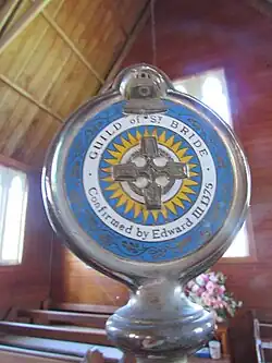 The puriri block foundations was replaced with concrete in 1953.[2] A neighbouring property was purchased in 1956 to serve as a Sunday school and church hall.[1]: 44 In 1961 a stained-glass window, created by Whitefriars Stained Glass Studio, was installed for the centenary. The left window shows Saint Bride with St Bride's Church, Fleet Street, shown below. The middle window shows Jesus Christ, with the Moravian Church seal shown below. The right window shows Bishop Selwyn and below it St Bride's Church, Mauku, with the stockade around it. The windows cost £600.[5]: 12