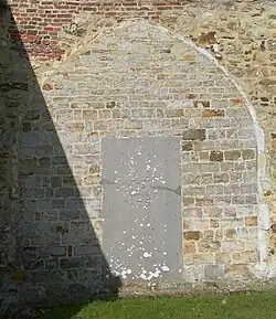 A rare "heart shrine"—a memorial to a parishioner who died abroad (usually during the Crusades)[34] but whose heart was returned and buried in the church—is in the chancel.[9] It measures 27 inches (69 cm) and is placed in an alcove 34 inches (86 cm) long and 30 inches (76 cm) above the floor.[35] It was designed in about 1270[34] and may commemorate Richard de Cahaignes[10] or one of his family.[34] A study in 1846 described the effigy as being "of a fine grained oolite or sandstone" and taking the form of a cross-legged knight wearing 13th-century[9] armour (painted rather than carved on to the stone, and now invisible) and holding a sword but no shield. The lower parts of the knight's arms have broken away, but the hands would have been clasped in prayer.[36] One writer on the subject of effigies[note 4] has stated that it is "one of the most curious and interesting monumental effigies in Sussex, if not in England".[37]