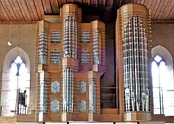 Five bids were considered, but the contract was awarded to the Manufacture d'Orgues Thomas of Sert-Francorchamps. The Thomas organ is faithful to the North German baroque tradition in its mechanical traction, in what stops it has and in the materials of its pipes. But it has a number of modern features. The most noticeable of these is the decidedly contemporary look of its organ case, asymmetrical and decorated with horizontal resin strips whose LEDs can emit light of different colors. Of greater importance for the organist is that the range of its three manuals (C–G''') and its pedal (C-F') is wider than the organ’s models, that its tuning is modern (A = 440 Hz) so that the organ can easily be used in ensembles, and that its stops and their combinations are selected electronically.