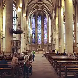 In 1270 a three-nave Gothic hall church was built on the site.[3] The west tower was extended again at the same time, this time with an additional storey taking it up to 40 metres. The facade of the 1270 extension contains a 1302 Jewish gravestone looted during the 1350 Pogroms.[4]