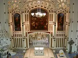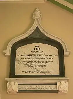 The ornate stencilling around the sanctuary, painted over in the 1950s, was restored as were the altar rails and the intricate mosaic floor. The Solemn Re-Opening and Dedication of the altar was celebrated on 29 March 2009 by the Bishop of Down and Connor, Dr Noel Treanor, in the presence of the Bishop Emeritus Dr Patrick Walsh.