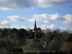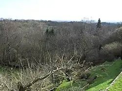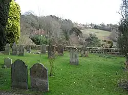 St Margaret's Church has an extensive terraced churchyard with far-reaching southward views across the Weald to the South Downs. Set across six levels, it is heavily planted with trees and flowers—more than 100 species have been documented—and has several seats and a signposted viewing area.[2][4][16][28][29] It has been extended several times. One extension, described in 1935 as "recent", brought an artificial cave, possibly of medieval origin, into its boundaries. It is hewn out of the rock near the floor of the valley above which the churchyard sits.[19]