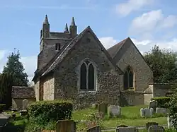 The church consists of a nave, an angled chancel offset slightly towards the north, a 66-foot (20 m) tower at the west end, a north aisle, separated from the nave by a three-bay pointed-arched arcade,[5] a vestry on the north side and an entrance porch on the south side. There are other entrances in the base of the tower and its stair-turret. The nave is 42 feet (13 m) long and 20+1⁄2 feet (6.2 m) wide; the chancel measures 23+1⁄2 by 18 feet (7.2 m × 5.5 m) and has walls of 3 feet (0.91 m) thickness.[2][5] They are separated by a chancel arch. The walls are of rubble laid in courses with sandstone dressings, except for the tower (which is ashlar)[5][8] and the Victorian north aisle, whose walls are in the style of crazy paving.[10] The east windows in the chancel and north aisle have y-tracery, and a small oculus is set below the gable of the chancel wall above the main window.[10] The roof is tiled with Horsham Stone.[8]