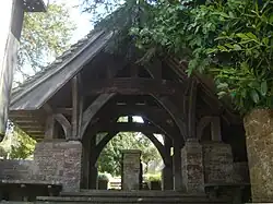 The Huth family were important in church life in the 19th and 20th centuries. Henry Huth was a bibliophile whose enormous collection of rare books was sold for £300,000 in 1910 (£38,680,000 in 2023).[17][18] He lived in an extravagant château-style 1870s house called Wykehurst Place in the parish,[19] and was buried in the churchyard after his death in 1878. In 1905, his son Edward gave the church a large, "magnificent"[1] lychgate constructed from local materials:[7] oak, millstones from a mill in the parish, Sussex Marble (a locally quarried limestone) and a Horsham Stone slab roof.[8][18] It stands at the end of the twitten leading to the churchyard, which has been left slightly overgrown to conserve wildlife.[7] A mid-19th-century rector planted the churchyard and rectory grounds with a wide range of trees, many of which survive—including Bhutan pines and oaks from Somerset.[20] There are many Victorian tombs and grave-markers in the churchyard, including some rare wooden grave-boards and some with wooden cross-pieces set between stone balls.[7] Another of Huth's sons, Alfred Henry Huth—who also became a book-collector and author, and who died in 1910—is commemorated by a memorial tablet inside the church; its style was described by Nikolaus Pevsner as "neo-late 17th-century".[10]