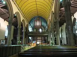 The church has three light windows set in recesses with quatrefoils. The floor is stone flagged and the nave ceiling wooden tunnel-vaulted. There is an organ on a mezzanine level at the east end of the north aisle. The reredos is carved and gilded wood.